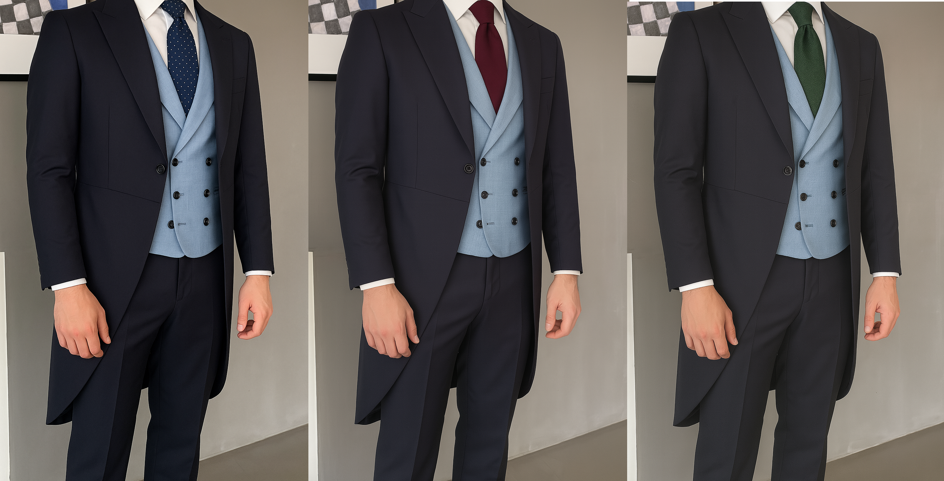 - Complementos: Para evitar la típica corbata azul de topos blancos, podrías considerar una corbata de seda con pequeños motivos discretos o en tonos pastel para un toque de distinción. El pañuelo blanco sigue siendo la opción más elegante y versátil.