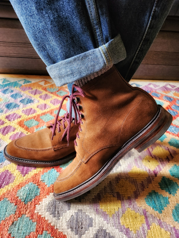 Son unas Loake Anglesey en serraje. Previamente tuve otras en grain pero me apretaban demasiado, el apron es complicado a veces, para pies altos de empeine como los mios,